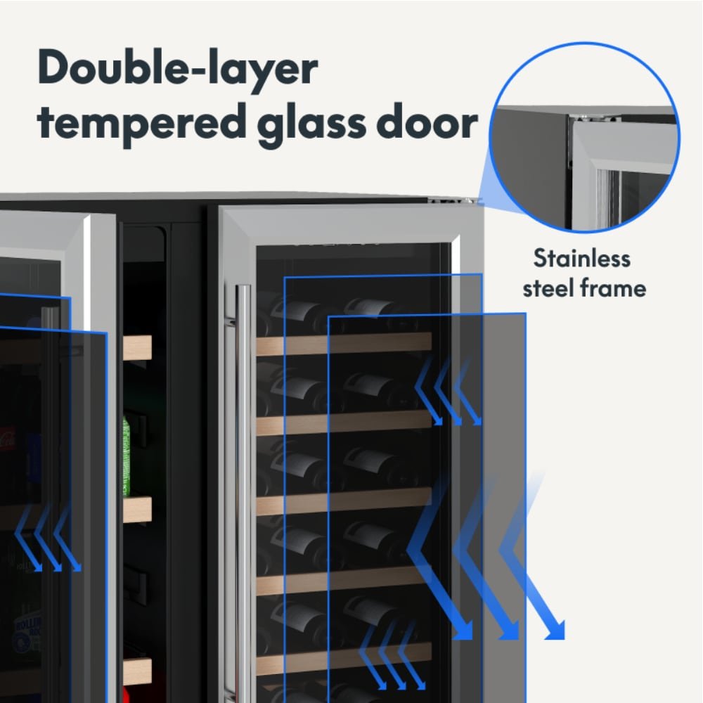 [Premium Materials]The door frame of this wine fridge is made from high-quality stainless steel, which is sturdy, rust-resistant and wear-resistant. The double-layer tempered glass effectively insulates and blocks UV rays. The reversible door features hidden hinges, letting you choose its direction. The amber light is particularly recommended for a high-end, elegant look.