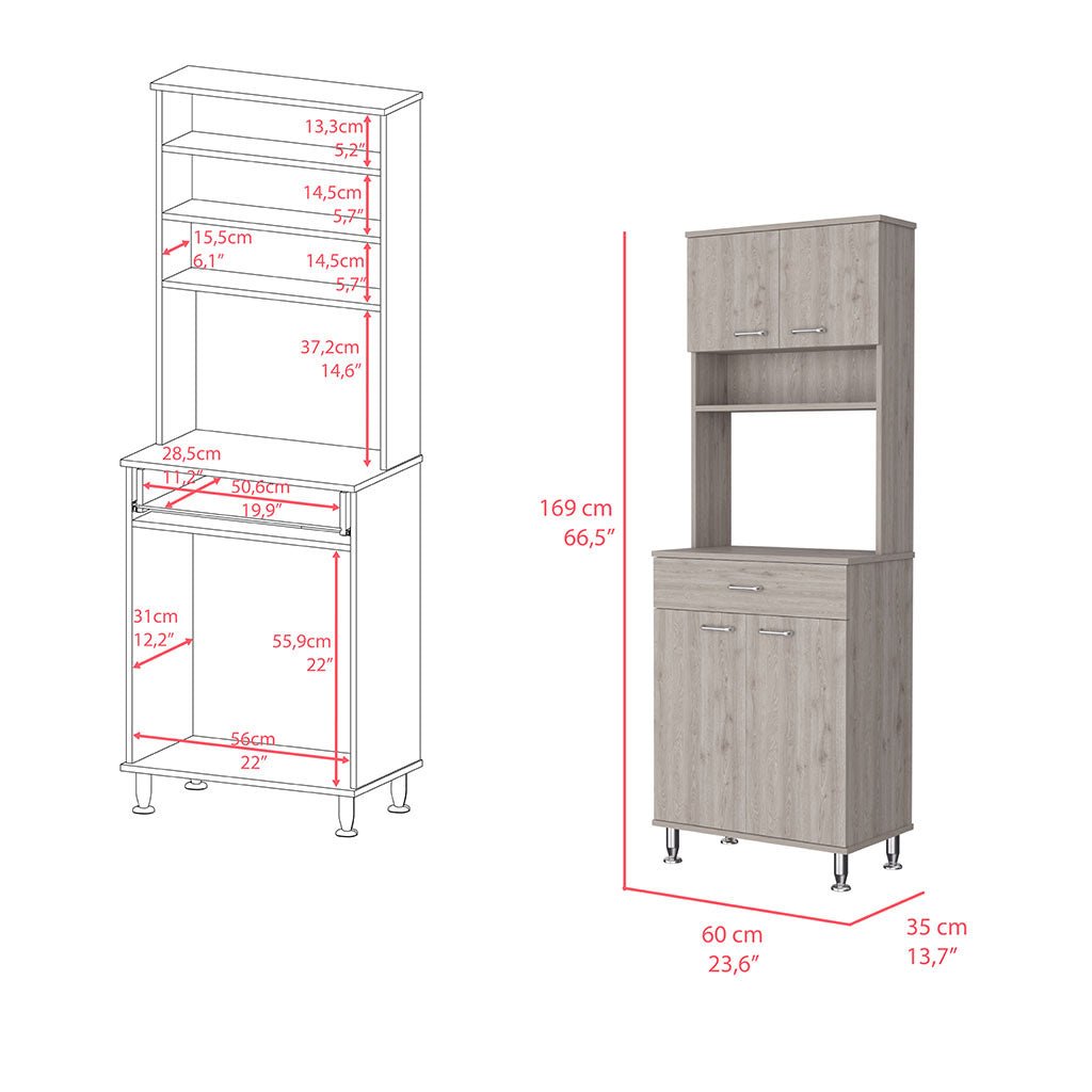 The Piacenza Pantry is a kitchen organization station that frees up valuable counter and cabinet space, holding your microwave, coffee maker, and other small appliances. This kitchen pantry also features a spacious drawer and hidden storage behind two lower panel doors. The hutch features a top cabinet with two doors and a shelf inside. The counter is 23.6 wide by 13.9 inches deep. Making it ideal for most Microwaves or small appliances. The bottom drawer works great for utensils and the large two-door cabinet below is perfect for larger objects. This product has adjustable metal legs to provide stability, designed in elegant light gray Manufactured Wood.Dimensions:Height: 45'Width:  33'Depth:  13,70'Furniture Type: Ready to assemble (full assembly required)Certifications: CARB phase II compliant – TSCA Title VI Compliant Warranty: 1-year warranty coverage in wooden parts- 1-year warranty coverage in hardware pieces since its manufacturing date found in the lot number printed in the product box Shipment details: Free shipping to the 48 contiguous states - delivery time: Between 2 and 5 days depending on the customer's location, season and weather factors.Other details: This product does not include decorative or background elements; Check that the box is in good condition, well packed and check with the help of the manual that the corresponding parts have been included; For more information regarding warranty, shipment details, cancellations, returns & replacement parts go to the bottom section of our website to learn more; Installation & Assembly Instructions included.