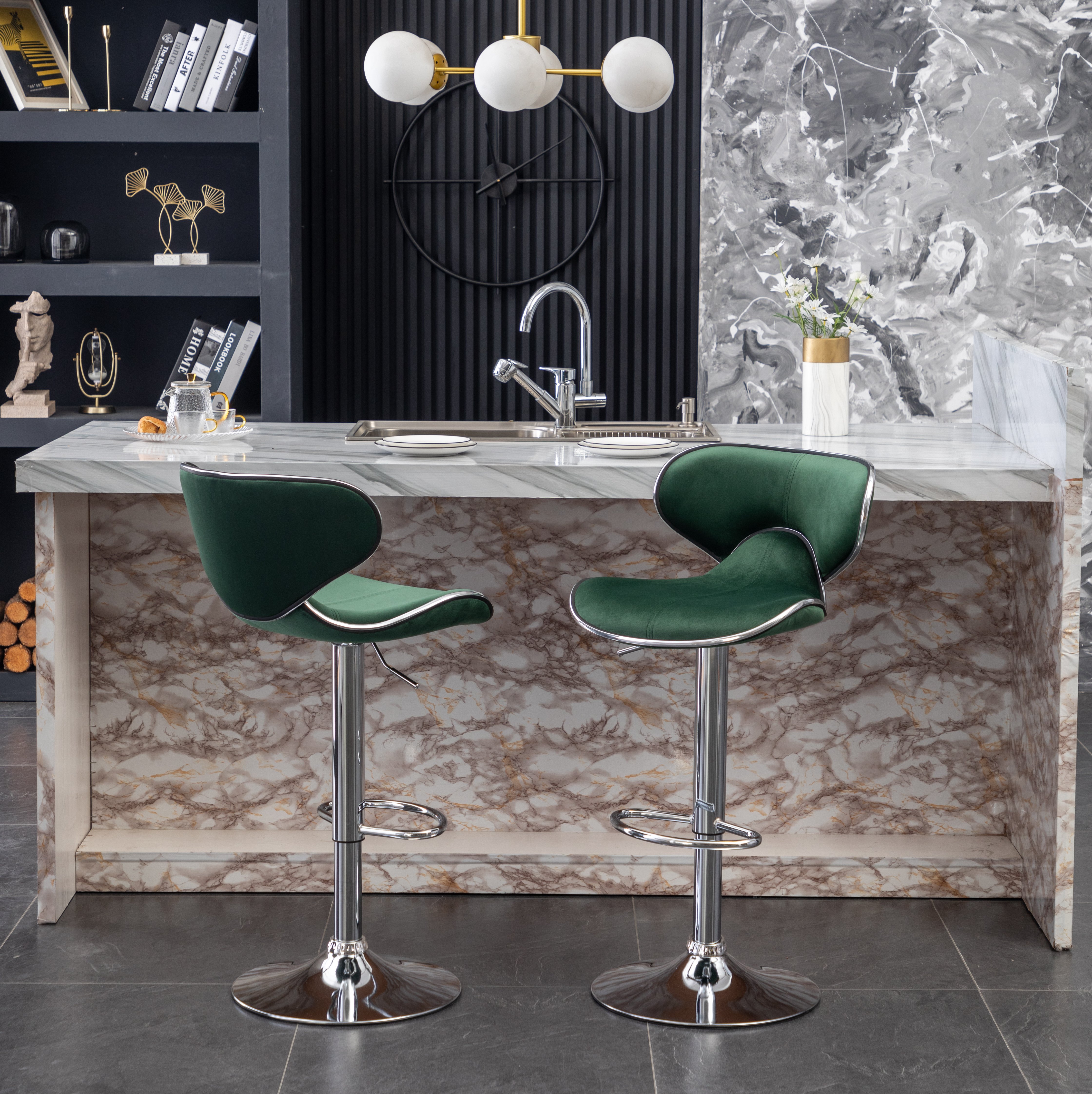 Masaccio Velvet Upholstered Adjustable Swivel Barstool, Set of 2, GreenGiddy up and ride off into the stylish sunset with the Masaccio Velvet Upholstered Adjustable Swivel Barstool's stool features a comfortable swiveling seat with easy gas-lift height adjustment. The soft velvet upholstered seat and back are trimmed in chrome and come in a variety of color options. Maneuver with ease while seated at your bar with this stylish bar stool. Its chromed disk base includes a built-in footrest.