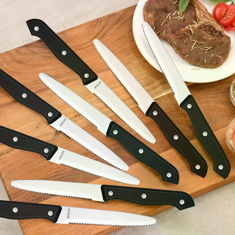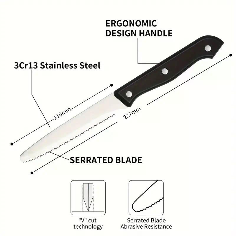 Steak Knives Set of 12, Serrated Steak Knives with POM Three Rivets Handle, Dishwasher Safe, for Family, Party, and Restuarant