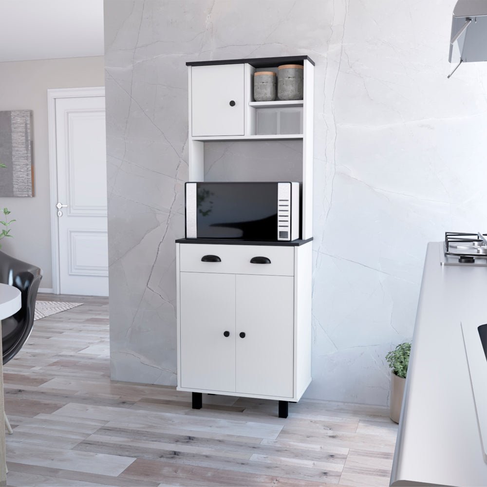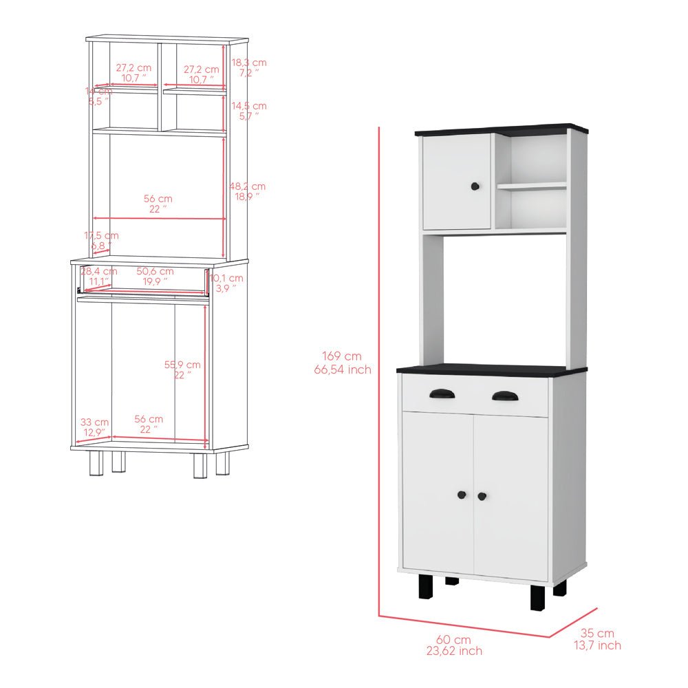 Elevate your kitchen with the "Naomi Kitchen Pantry," featuring a white finish with chic black handles. This unit includes an array of storage options, from shelving (5.7"H x 10.7" W) to a drawer (3.9"H x 11.1"), a cabinet (22"H x 12.9"D), and a microwave black space (22"W x 18.9"H), making it a versatile addition to any kitchen.Dimensions: Height: 66.54'Width: 23.62' Depth: 13.7'Furniture Type: Ready to assemble (full assembly required).Certifications: CARB phase II compliant – TSCA Title VI Compliant.Warranty: 1-year warranty coverage in wooden parts- 1-year warranty coverage in hardware pieces since its manufacturing date is found in the lot number printed in the product box.Shipment details: Free shipping to the 48 contiguous states - delivery time: Between 2 and 5 days, depending on the customer's location, season, and weather factors.Other details: This product does not include decorative or background elements; Check that the box is in good condition and well packed and check with the help of the manual that the corresponding parts have been included; For more information regarding warranty, shipment details, cancellations, returns & replacement parts go to the bottom section of our website to learn more; Installation & Assembly Instructions included.