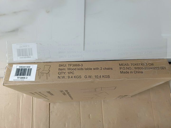 Product size - Table:23.6'' W x 23.6'' D x 17.3'' H ,Chair: 13.4'' W x 13.4'' D x 20.1'' H ,weight: 9.4KG/ 20.72lb