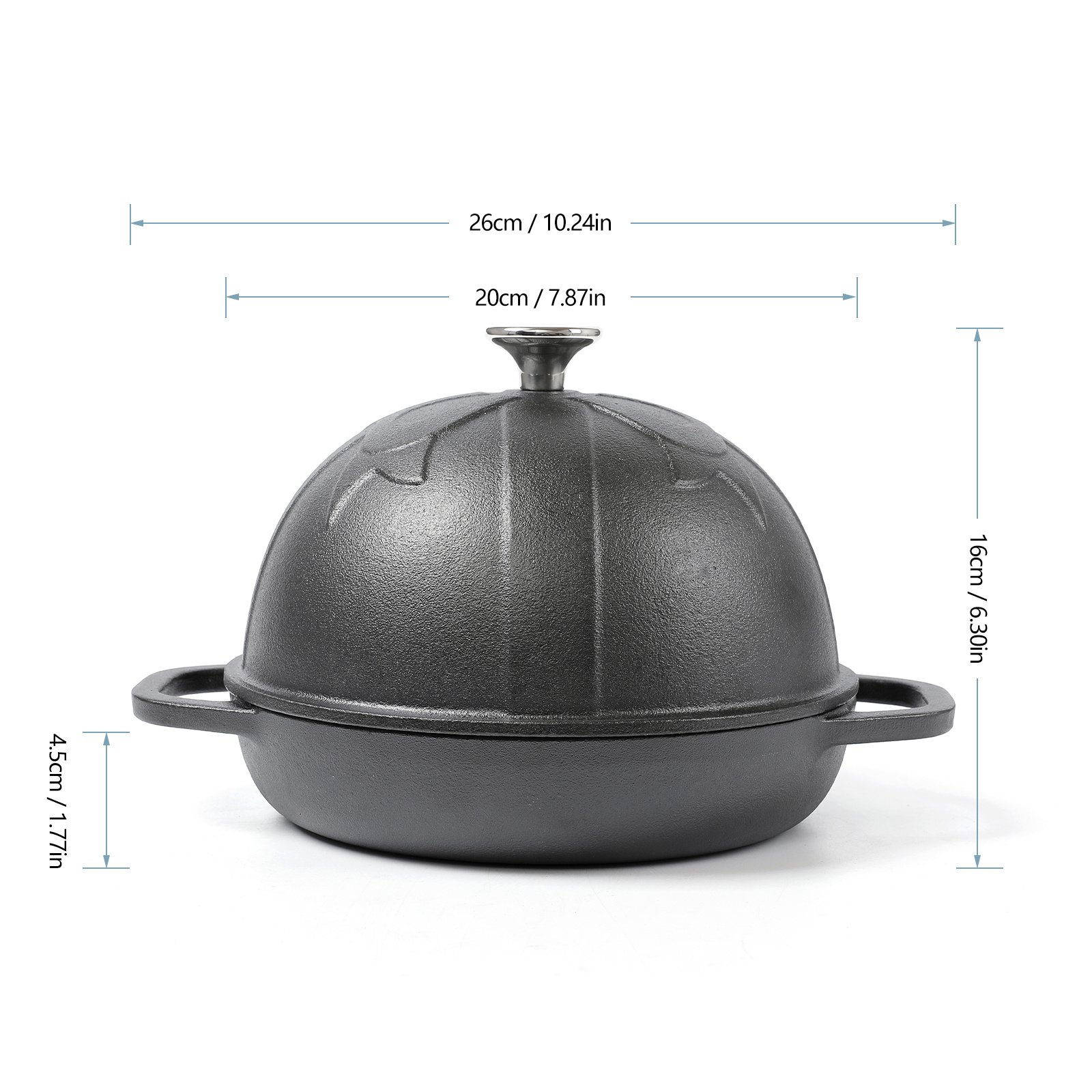 Say goodbye to your traditional pans. You can expect crispy crusts and moist interiors that rival any bakery using the HAWOK Bread Cloche. Its entire body is designed with cast iron and seasoned with vegetable oil. The cast iron delivers superior and even heats distribution. Its tight-fitting lid effectively seals in moisture and flavor and creates a thick, crispy crust and a light, airy inside. The lid features stainless steel knobs that are safe at all oven temperatures, making it easy to move. The low-profile base has raised ridges for even browning and marks the loaf with the lollipop. It can also be used as a skillet. In addition, you will receive two ergonomic ring handles that provide a comfortable, safe grip and ease of movement from kitchen to table. After finishing cooking, hand wash with warm water and dry thoroughly with a towel. This HAWOK bread cloche is the perfect present for weddings, housewarmings, birthdays, holidays, and more.