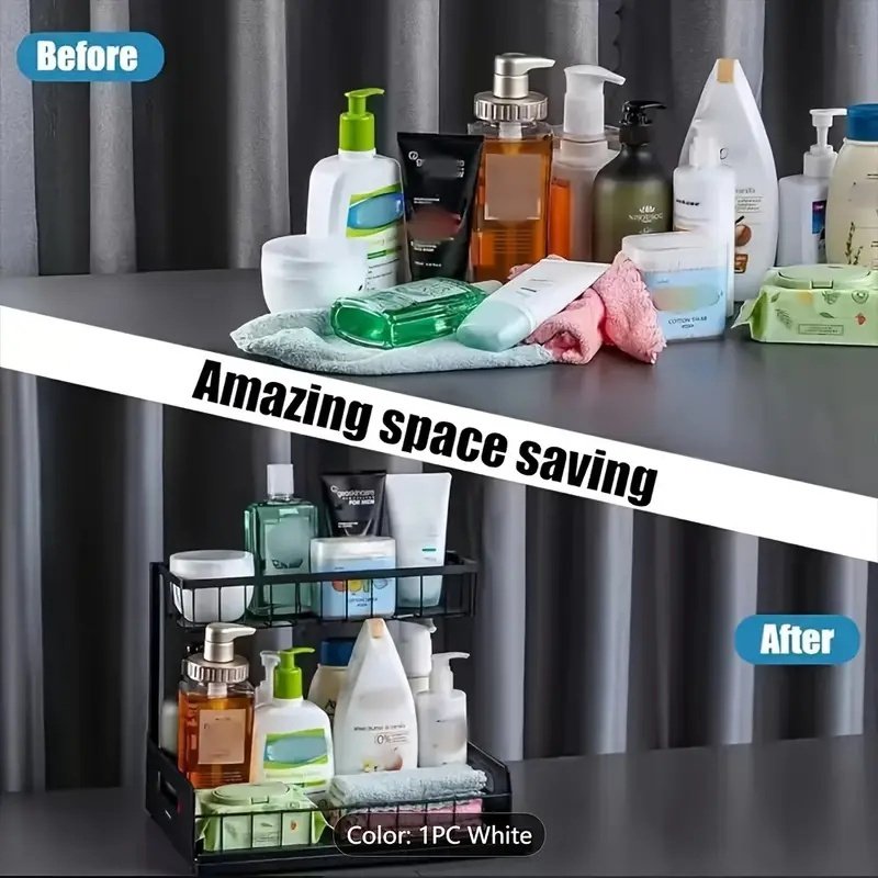 L Shaped Design: L-shaped design with narrow top and wide bottom, leaves space for plumbing and garbage disposal, maximizing the vertical space of the sink. And the bottom tier leaves a suitable space for your tall bottles, which can solve your cabinet storage troublesSliding Storage Drawer: The under sink organizer is designed as a sliding drawer with handles, can be pulled out smoothly, allowing you to easily access the items stored at the bottomEasy Installation and Stable: No tools required. It only takes a few seconds to install. Double design with bottom suction cups and tapes. No need to punch mounting screws, but more stable than it isSturdy and Clean: Made of high quality steel, can bear 50 lbs. With baking paint, beautiful and rust-proof. Sink shelf is grid design to prevent water accumulation; 2 pads to prevent objects from falling, removable and washableMulti-purpose Organizer: Assembled Dimensions: 14.2*10.6*11 in. Top basket: 14.2*5.4*2.3 in, bottom basket: 14.2*8.9*3 in. The bottom area can hold bottles up to 8 inches in height. (Warm Tips: Please take measurements before ordering.)Ideal for sinks, kitchens and bathrooms. It can be used as bathroom toiletries storage, kitchen spice rack or laundry room storage, etc. to keep your items organized and in order
