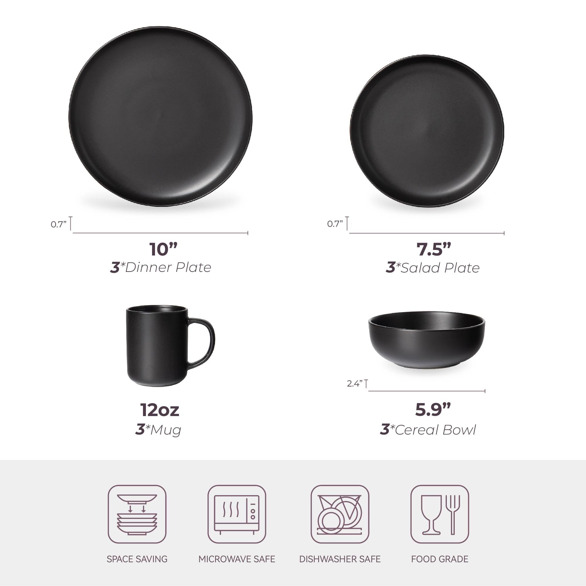 [["[Premium Stoneware Construction]","Crafted from high-density stoneware fired at 1180°C/2156°F for 8 hours, these chip-resistant dishes withstand daily use while maintaining elegant matte glaze finish."],["[Complete 12pc Service for 3]","Includes 3 dinner plates (10\"), 3 salad plates (7.5\"), 3 cereal bowls (5.9\"), and 3 mugs (12oz) - perfect for small families or couples."],["[Ultimate Kitchen Convenience]","Dishwasher-safe for effortless cleanup & microwave-safe for direct heating. Stackable design saves 50% cabinet space (13.78×12.20×12.20inch compact packaging)."],["[Certified Safety Assurance]","Passed rigorous FDA/CA65 certifications - 100% free from BPA, lead, and toxic chemicals. Scratch-resistant surface ensures long-lasting beauty."],["[Modern Durable Design]","Reactive matte glaze resists fading, while reinforced rims prevent chipping. Heat-retention stoneware keeps food warmer 30% longer than ceramic."]]