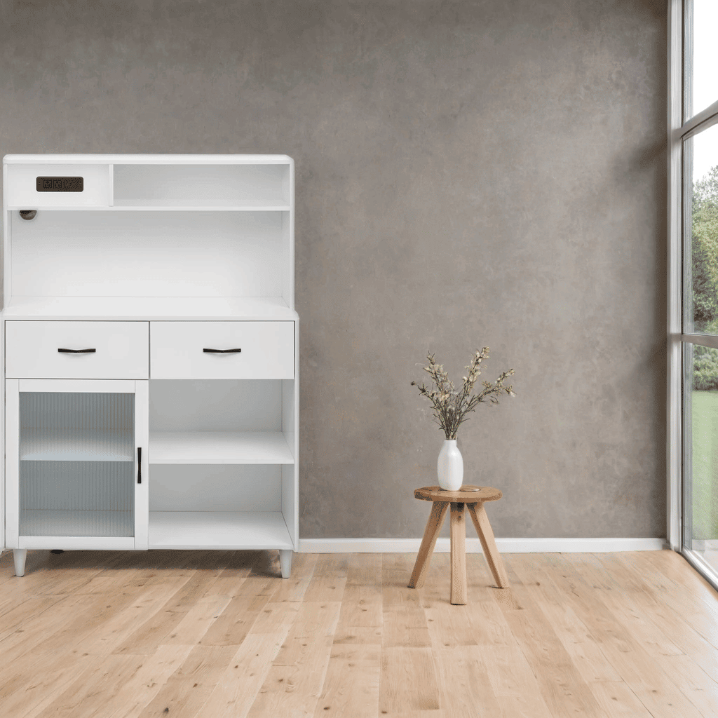 Functional Storage SolutionsDouble Drawers: Perfect for organizing utensils, dinnerware, or valuables. Glass-Door Compartment: Provides clear visibility and dust-free protection for frequently used items like snacks or small appliances. Open Shelving: Ideal for displaying decorative pieces or everyday essentials, maximizing convenience and style.