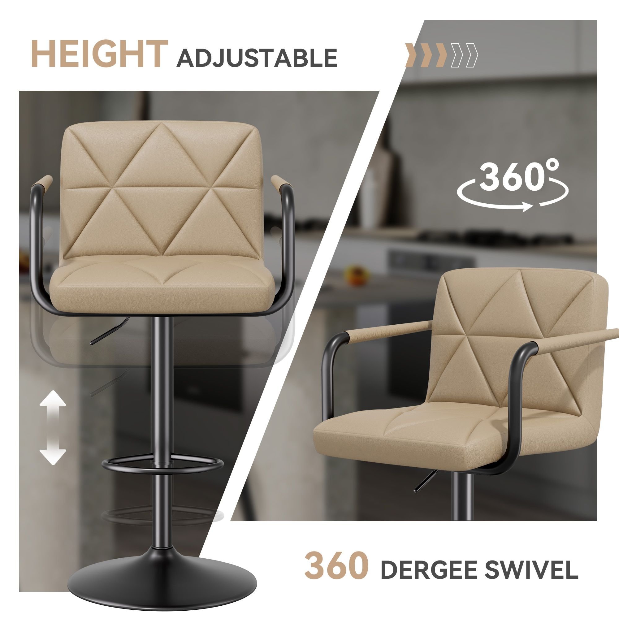 [Swivel & Adjustable]The seat height can be adjusted from 25.5-34.5 inches , which is free and flexible, suitable for different table heights and meeting different life needs. The 360° swivel seat, rotating smoothly and silently, provides more convenience and helps you to easily access items and sit in a comfortable position.